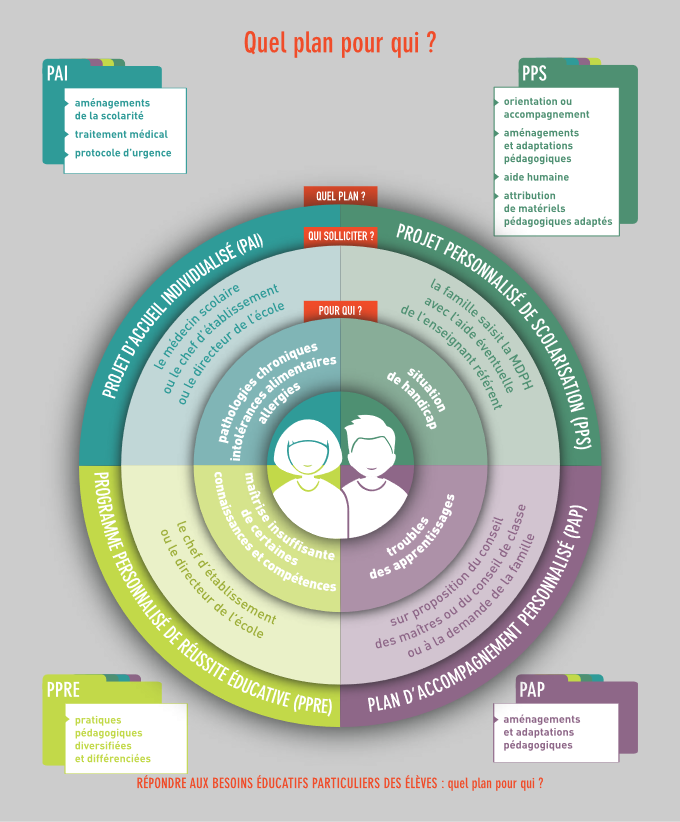 - Le projet d’accueil individualisé (PAI) défini dans la circulaire n° 2003-135 du 8 septembre 2003 permet de préciser les adaptations nécessaires (aménagements d’horaires, organisation des actions de soins, etc.) pour les enfants et adolescents dont l’état de santé rend nécessaire l’administration de traitements ou protocoles médicaux afin qu’ils poursuivent une scolarité dans des conditions aussi ordinaires que possible. Il est rédigé en concertation avec le médecin de l’éducation nationale qui veille au respect du secret médical.