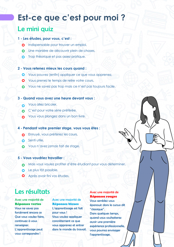 Bon à savoir : Les apprentis qui souhaitent faire une période de stage à l’étranger ou étudier dans un centre sont encouragés à le faire pour une période courte ou de plusieurs mois, en accord avec l’entreprise d’accueil ou le centre de formation.